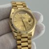 A gorgeous Rolex wristwatch! Crafted in vibrant 18k yellow gold, this Lady-Datejust watch was created in the mid 1980s. The circular face of the watch features twelve gold dashes and three gold hands. Additionally, the face is decorated with the Rolex logo and signature, and the words “OYSTER PERPETUAL DATEJUST”. The bottom of the face also reads “SUPERLATIVE CHRONOMETER OFFICIALLY CERTIFIED”. The face is held within a ribbed gold frame, which further elevates the impressive watch. The crown at the side of the face is gold and circular in shape, and features a carved Rolex logo. The band is also crafted in 18k yellow gold, and features a flexible tire-track design. The band secures with a watch clasp, which is marked by a small three-dimensional Rolex logo. The inside of the clasp also features various markings which include the Rolex signature,”8570″,”GENEVE”, “ROLEXSA”, two “750” purity marks, “SWISS MADE”, a small carving of a woman’s side profile, and an “18K” purity mark. The watch has an automatic movement. A feminine and eye-catching piece, this Rolex would make a marvelous everyday piece or special gift!